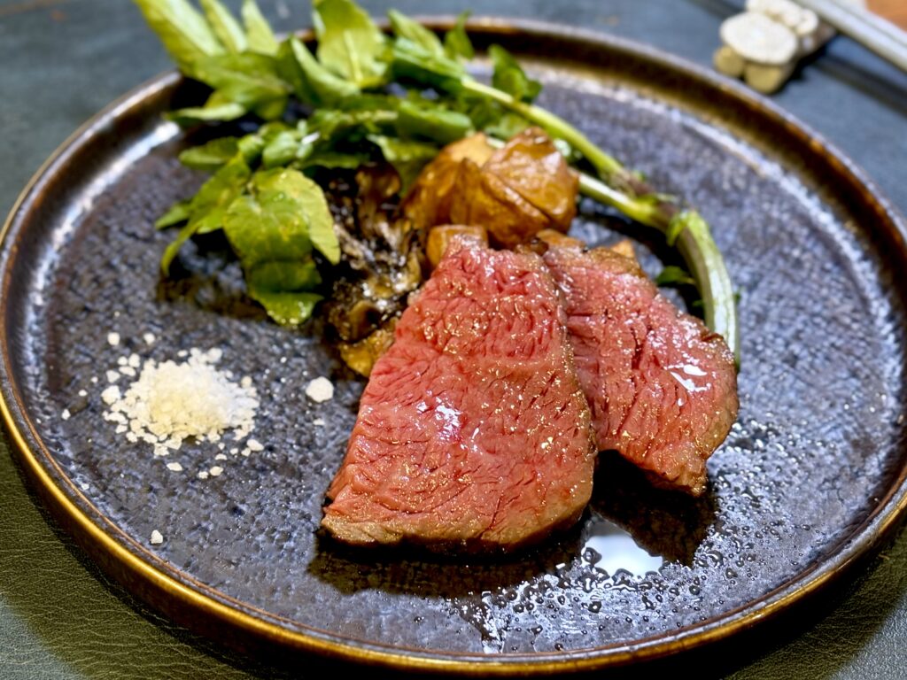 黒毛和牛ランプの低温調理ステーキ。柔らかさより“潤い”を守る火入れがポイント。55〜57℃で中心を整え、焼きは表面に香りを乗せるだけ。塩で食べる赤身のうまさをまとめました。