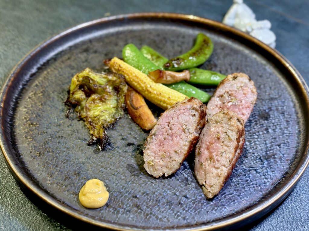 塩1.2%で味が決まる。屋我地島の塩で肉をまとめ、大津屋フェンネル5gでイタリアの香りを入場させる腸なしサルシッチャ。マイヤーでじっくり焼いて、朝はケールと大麦で整える。