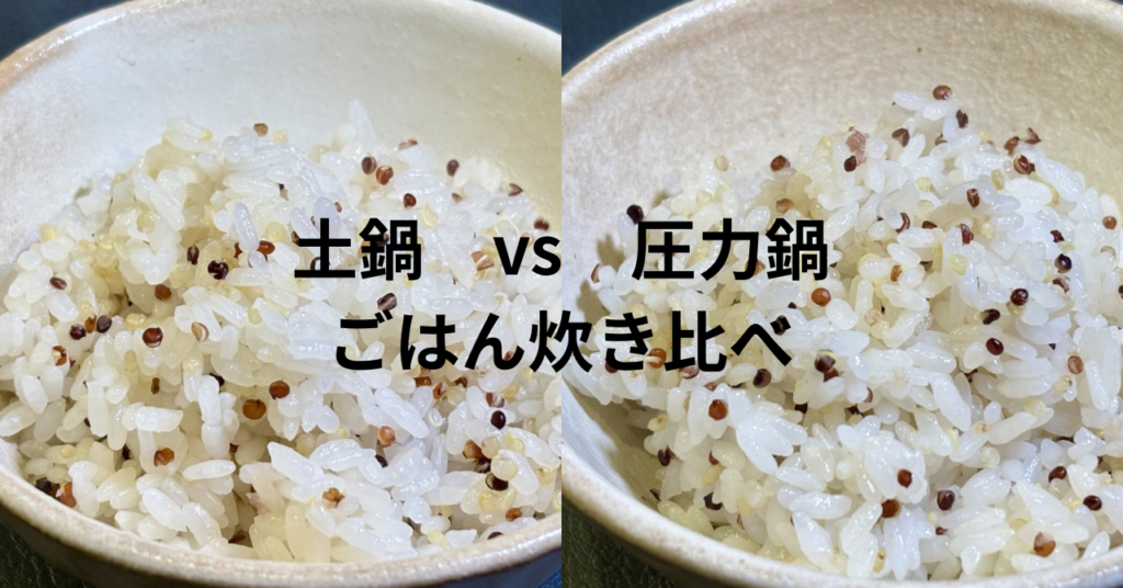 土鍋と圧力鍋で炊いたごはんはどちらが美味しい?菊花ごはん土鍋とマイヤーハイプレッシャークッカーでキヌアごはんを炊き比べ。粒立ち・甘み・炊飯時間、さらにおにぎりの美味しさまで検証しました。
