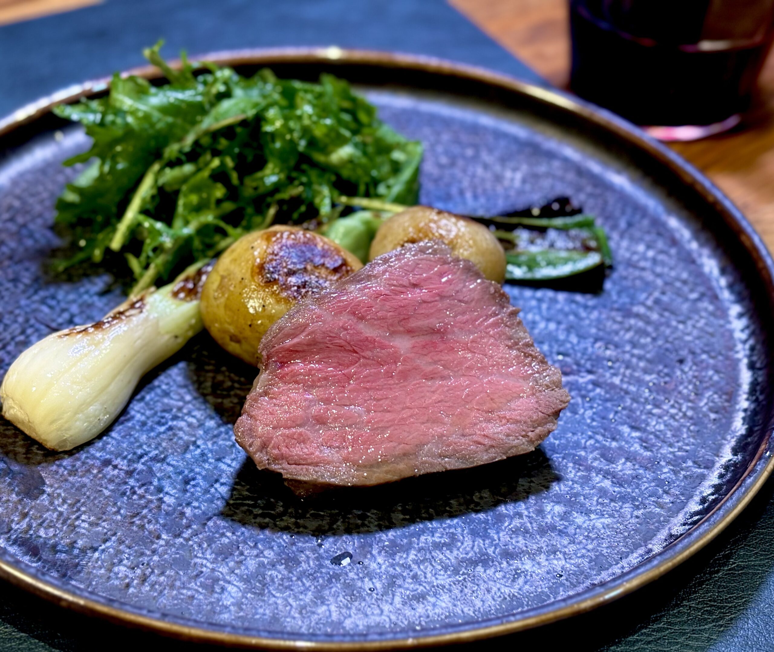 ③ 黒毛和牛の低温調理ステーキ&葉玉ねぎと新じゃがのソテー