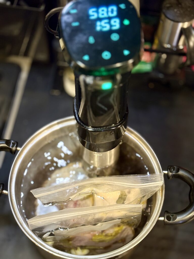 肉の中心状態を揃えるために使っている低温調理器。揚げ焼きや仕上げ調理の前に、