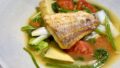 ウドとチンゲン菜花の粒マスタードバターソテーを添えて、完成。