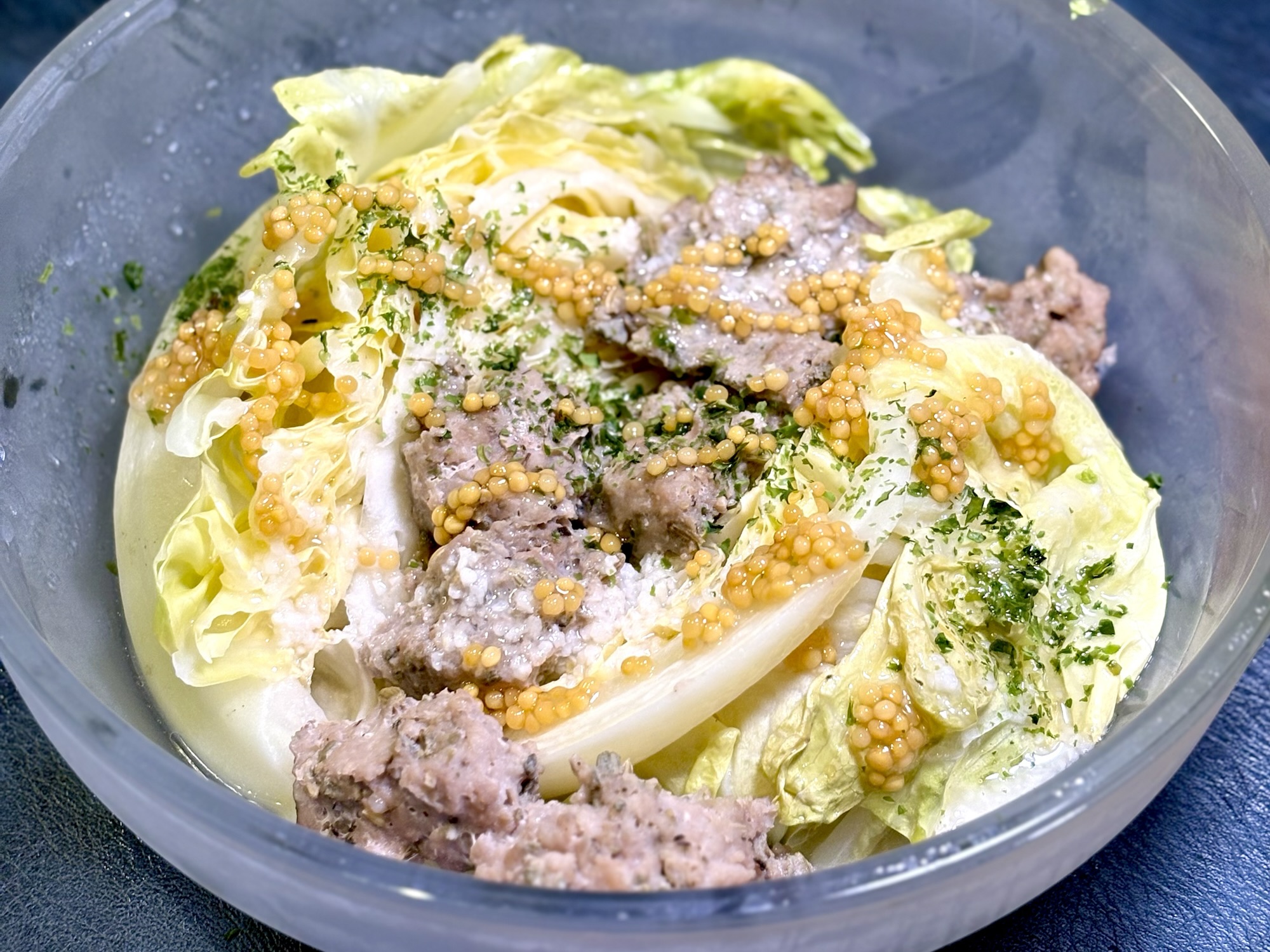 キャベツと玉ねぎから出る水分で、容器の中はしっかり蒸気がまわる。焼きつける料理ではなく、レンジの蒸気でやわらかく火を入れるイメージです。
