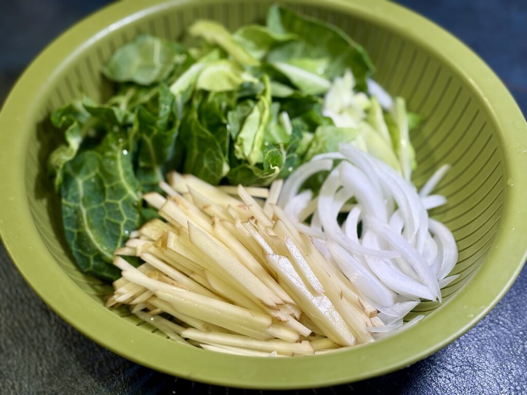 - 新じゃが芋は細切り、新玉ねぎは薄切り、春キャベツは食べやすく切る。
