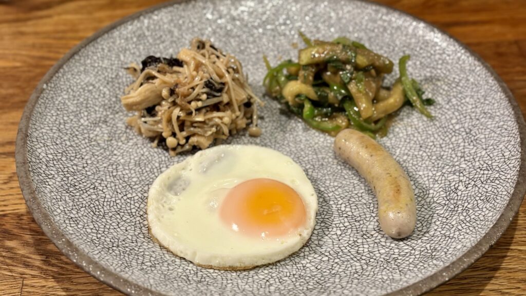 主役の目玉焼きと白ソーセージは安心の定番。茄子とピーマンは食物繊維とビタミンを供給し、リメイク料理のエノキ明太子は、家庭の知恵と工夫を映し出すワンシーン。