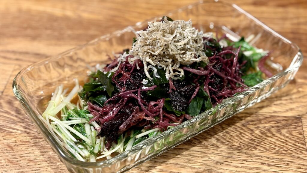 - 海藻とちりめんのサラダ(黒海苔・ワカメ・布海苔・水菜・ポン酢)