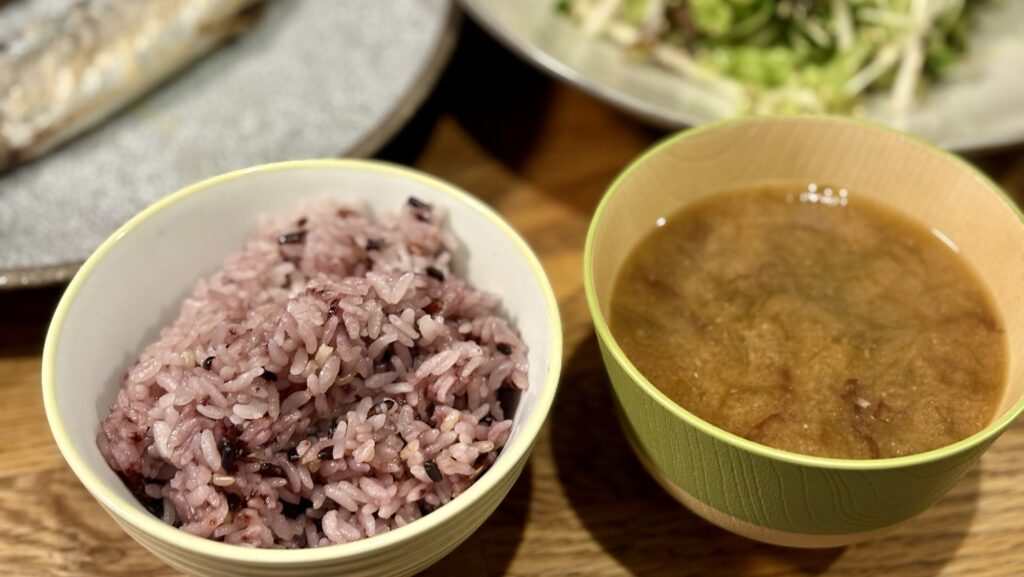 そして古代米のご飯に布海苔の味噌汁。色も香りも健康感満点で、「今日は午前中から仕事がはかどるはず」と妙に根拠のない自信が湧いてきます。