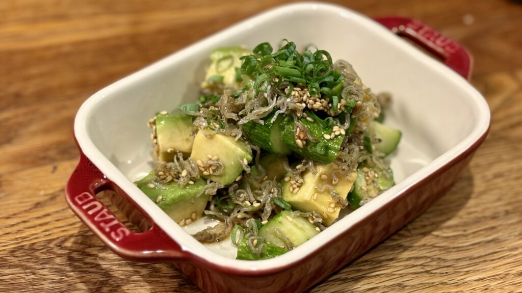 一方、ちりめんとアボカドの胡麻和えはカジュアル担当。ねっとりアボカドとちりめんの塩気が妙にお似合いで、「気楽な脇役こそ作品を支える」と納得。