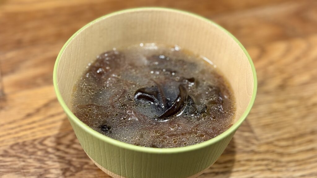 - スープを温め、キクラゲと布海苔を入れて塩で調える。
