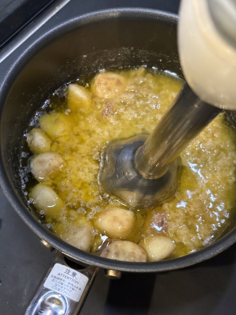 下処理したにんにくは、オリーブオイルと合わせたときの乳化が非常にスムーズ。